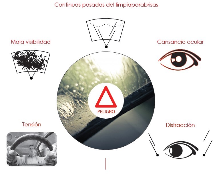 A todos estos obstáculos a la visibilidad en la carretera se añade el no disponer de un adecuado producto hidrofugante para el limpiaparabrisas.
